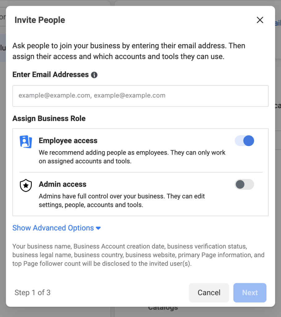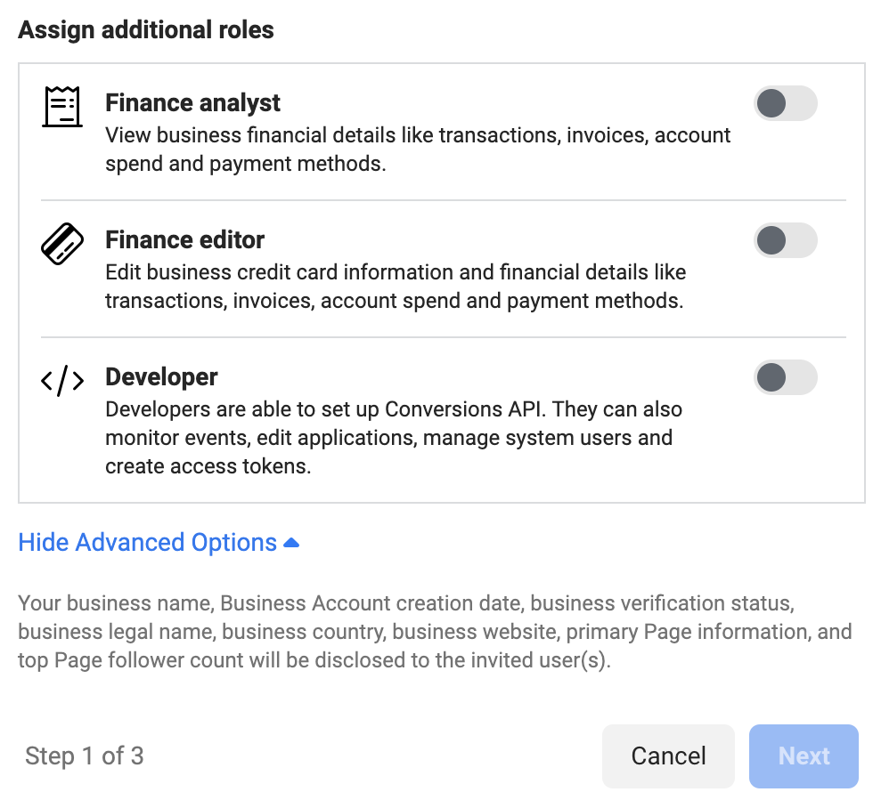 - Select the role for this person from the drop-down menu and click “Add.” (Choose the role by reading the descriptions carefully). If you click “Show Advanced Options”, you can also choose “Finance analyst” or “Finance editor” roles. Beware that these are Business Manager roles, and they’ll be applied to all the assets in your Business.