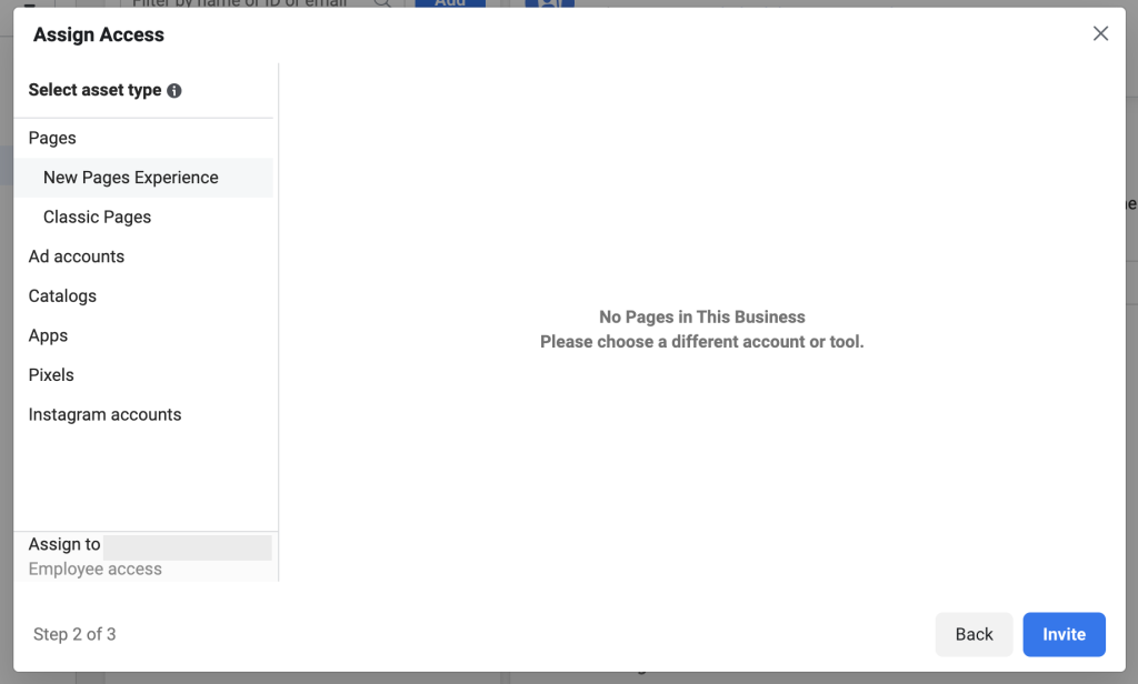 - Now click “Next” and choose the pages, ad accounts, and other assets you want to assign to this user.