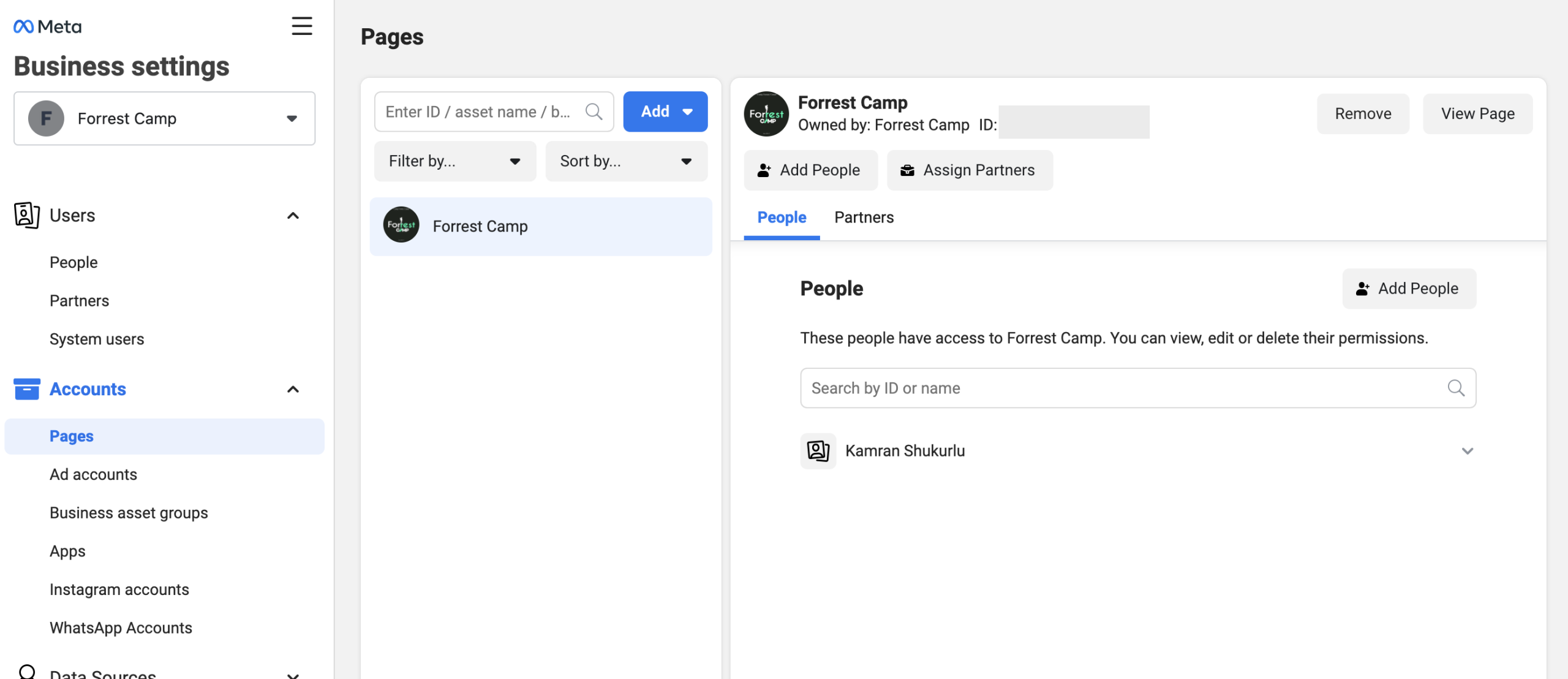 - Click on the Add page, and on the next screen, you can see your page. From there, you can grant people access to manage your page.
