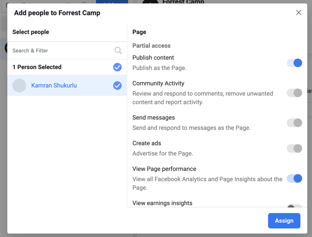 Step 2: Choose the page you want to assign other people to. On the right, you’ll see all people who have access to this page.