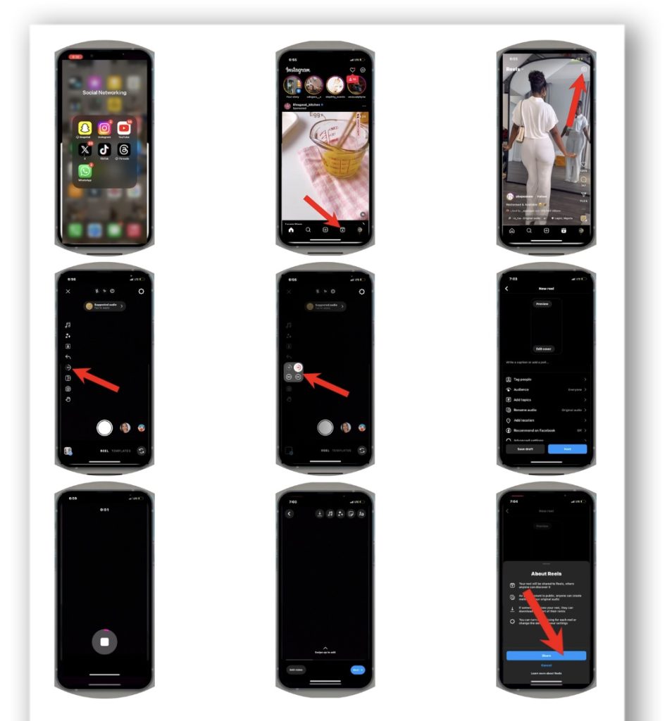 - Step 8: When you’re ready to share your reel, click next and share at the bottom of the screen.