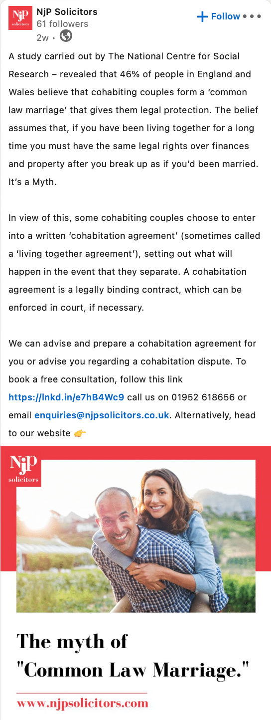 We have created professional, bespoke social media posts for many businesses in the legal industry. See below for examples of social media posts for legal firms.