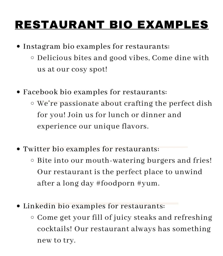 • Write a bio for your restaurant bio:  This is a great way to introduce people to your business and set you apart from the competition. So, here are some restaurant bio examples to get you inspired.