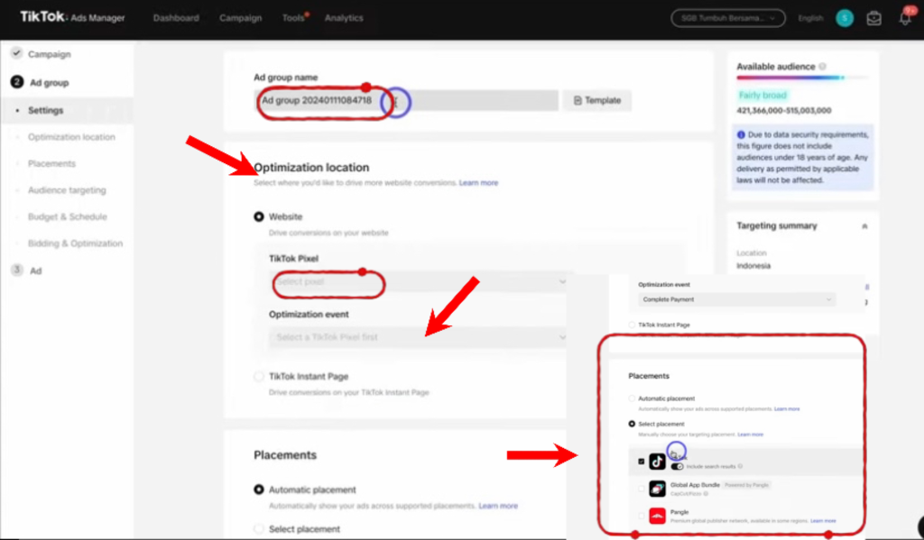 Then, select your TikTok pixel and choose the event you want to optimise. Go down to the optimisation event and click on “complete payment.” Set your placement options, ensuring your ad appears only on TikTok.