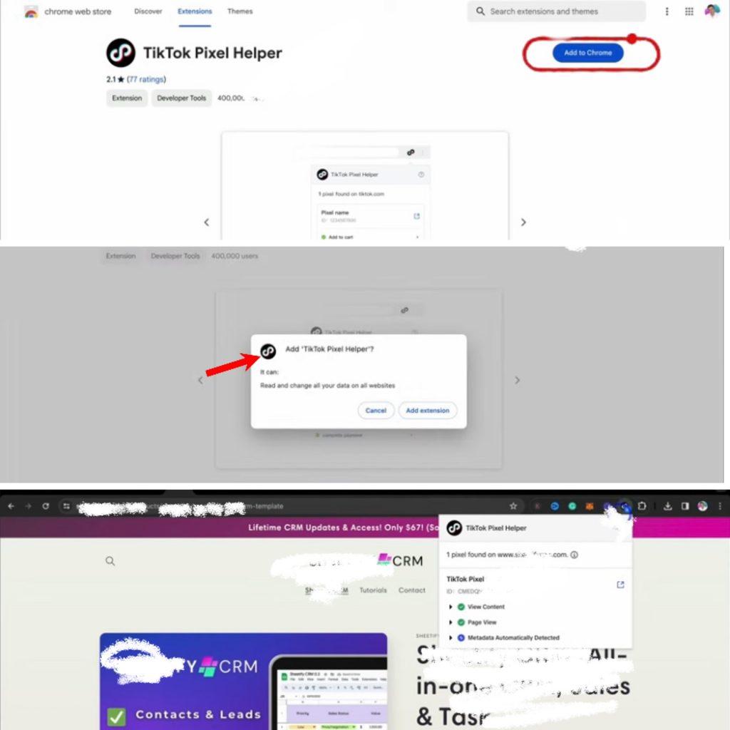 You’ll see a pending notification, but don’t panic. It just means it is being reviewed (usually within 24 hours). While you wait, install a Chrome extension called “TikTok Pixel Helper.” It will check the functionality of your pixel. Log in and click “Add to Chrome,” then tap “Add extension.”