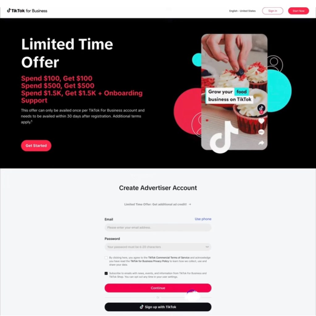 Go to the TikTok for Business website. Then, navigate down and sign up with an email or phone number.