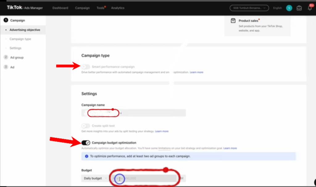 Under settings, you will change the name of your campaign. Then scroll down and turn on the “campaign budget optimisation”.