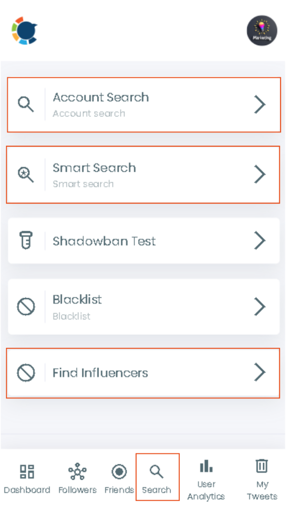 - Smart Search: Once you type in a keyword, it searches through the users’ profiles, bios, and tweets for that keyword, finding you accounts potentially interested in any topic.