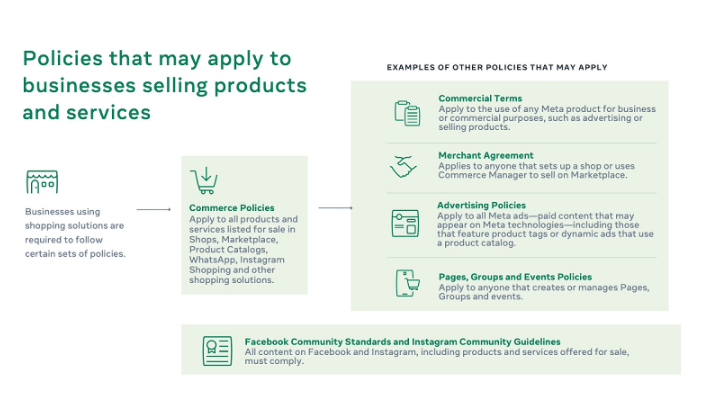 The next update is for Meta. Meta offers policy requirements for local businesses that plan to advertise and sell products on the platform. It includes Shops via Facebook Pages or IG profiles or on Facebook Marketplace.